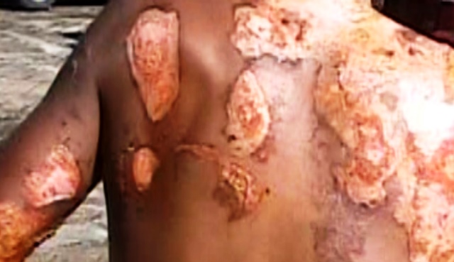 Con la espalda, los brazos y parte de la cara llenos de llagas producidas por el aceite caliente que le erosionó la piel, el joven Wellington Hernández Batista de 30 años de edad, explicó a los reporteros que la dueña de una fritura ubicada en la avenida de Penetración al Muelle solo identificada como Juana, conjuntamente con su hijo Alex, lo acusaron de haber robado unas porciones de bofe y sin mediar palabras le lanzaron un caldero de aceite caliente, dejándolo con profundas quemaduras.