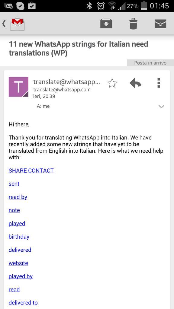 WhatsApp habría enviado un correo electrónico a dicho usuario pidiendo ayuda a traducir once nuevos términos, entre ellos, “read by” (leído por). Este sencillo mensaje ha desencadenado una ola de especulaciones sobre la posible llegada de la nueva función.Entre otros de los término que WhatsApp le pidió al usuario para traducir del inglés al italiano están: “reproducido por”, “enviado por”, “entregado” y “cumpleaños”. En el mensaje no se detalla las funciones.